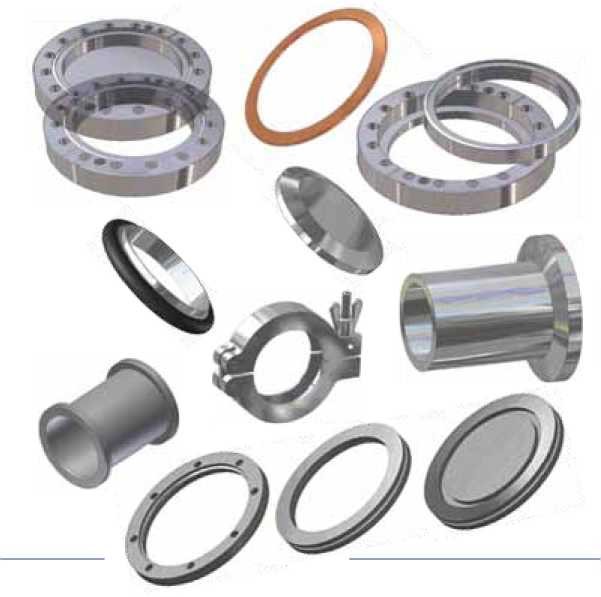 | CF (ConFlat) фланцы, известные своей надежностью и способностью поддерживать сверхвысокий вакуум, обычно изготавливаются из нержавеющей стали и используют медное кольцо в качестве уплотнителя. Это обеспечивает герметичность соединения даже при экстремально низких давлениях и высоких температурах. При проектировании изделий используются стандарты CF, ISO или KF. |